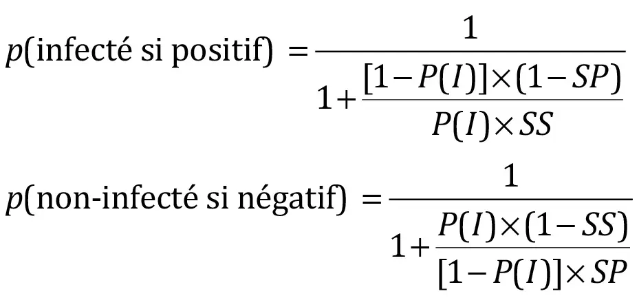 p(positif) = p(infecté)×p(positif si infecté) + p(non-infecté)×p(positif si non-infecté)= p(I)×SS + [1 – p(I)]×(1 – SP)